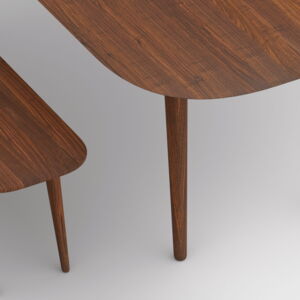 Runde nach unten verjüngte Tischplatte. Konische Beine.